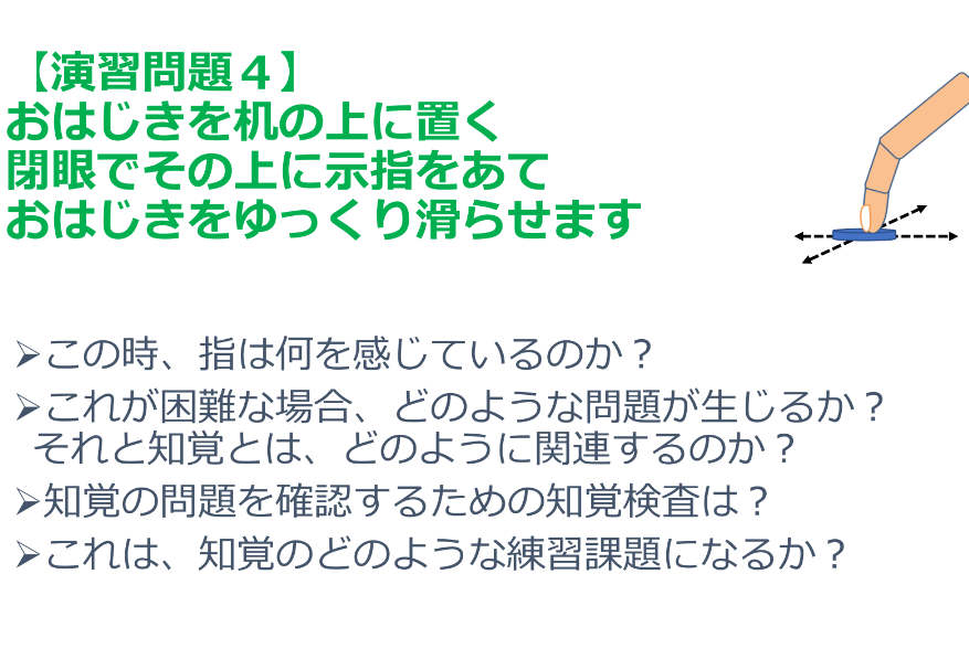 このような、動作障害の原因を推測したうえで、知覚から問題の原因を掘り下げ、手の知覚の役割について理解していきましょう。