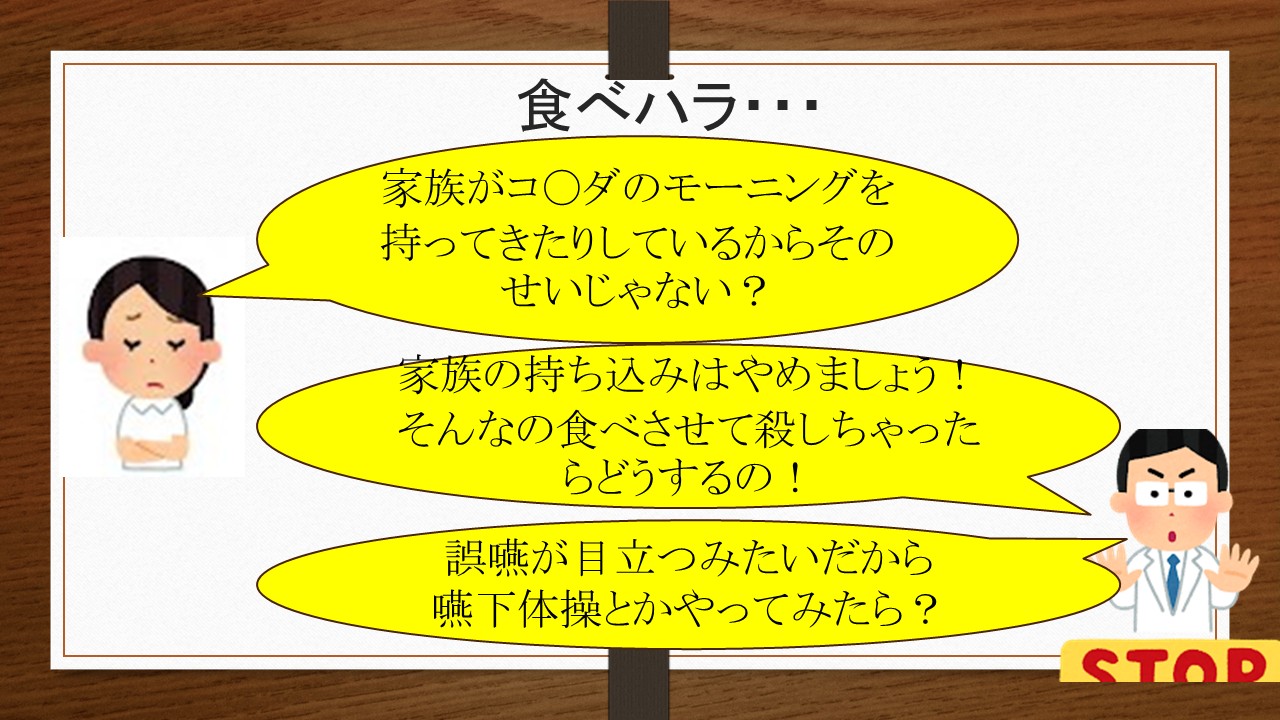 残念ながら、現場では病態を捉えることなく、単に「嚥下が弱いから、トロミ・ティースプーン1杯で」「飲み込みが悪いから誤嚥性肺炎のリスクが高く経口摂取は難しい」などと説明され、食事を禁止されたり、安全にという名のもとに変な回り道をさせられているケースを散見します。