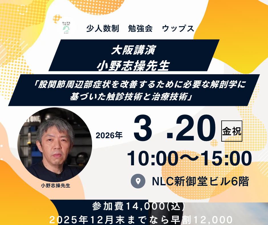 小野志操先生 大阪 「股関節周辺部症状を改善するために必要な解剖学に基づいた触診技術と治療技術」 小野志操先生 大阪 「股関節周辺部症状を改善するために必要…