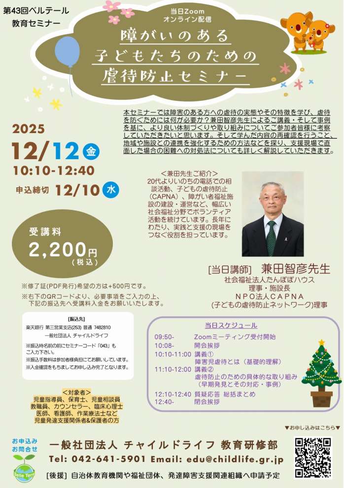 第43回ベルテール教育セミナーでは兼田智彦先生(子ども虐待防止ネットワーク理事)を講師に招きし、「障がいのある子どもたちのための虐待防止セミナー」をテーマに講義していただきます。