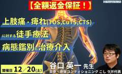 上肢痛やしびれ(TOS、CuTS、CTSなど)に対する徒手療法~疾患の鑑別と病態に応じたリハビリテーション~ 講師:谷口英一先生 上肢痛やしびれ(TOS、CuTS、CTSなど)に対する徒手…