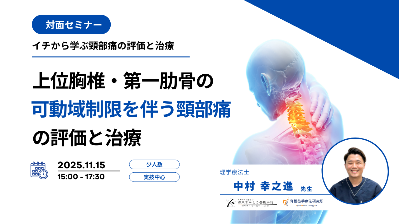 本セミナーでは、頸椎の最終域で痛みが誘発される頸部痛に対して、上位胸椎・第1肋骨の関節機能障害に着目した評価と治療介入の流れを学びます。