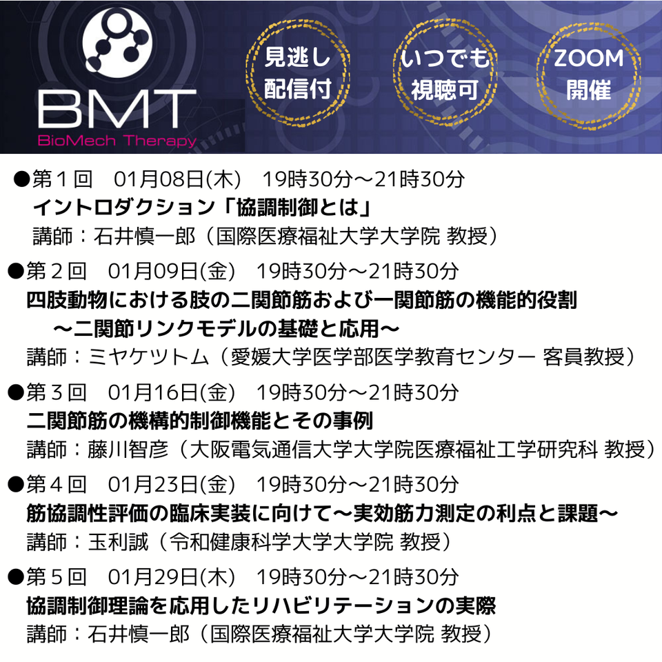 協調制御理論は従来のリハビリテーションの常識を覆し、「陸上運動の基盤」として新しい視座を提示しています。しかしながら、この理論はまだ多くの現場において十分に活用されていません。 本講演では、協調制御理論をリハビリテーション分野へ応用するための実践的な視点を提供することを目的に、工学・医学・進化生物学・リハビリテーションといった多分野にわたり、同理論に深い知見を有する専門家の先生方によるオムニバス形式の講義を行います。