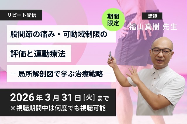 リピート配信 股関節の痛み・可動域制限の評価と運動療法 ― 局所解剖図で学ぶ治療戦略 ―(119分)(2026年3月31日まで視聴可能) リピート配信 股関節の痛み・可動域制限の評価と運動療法 ―…
