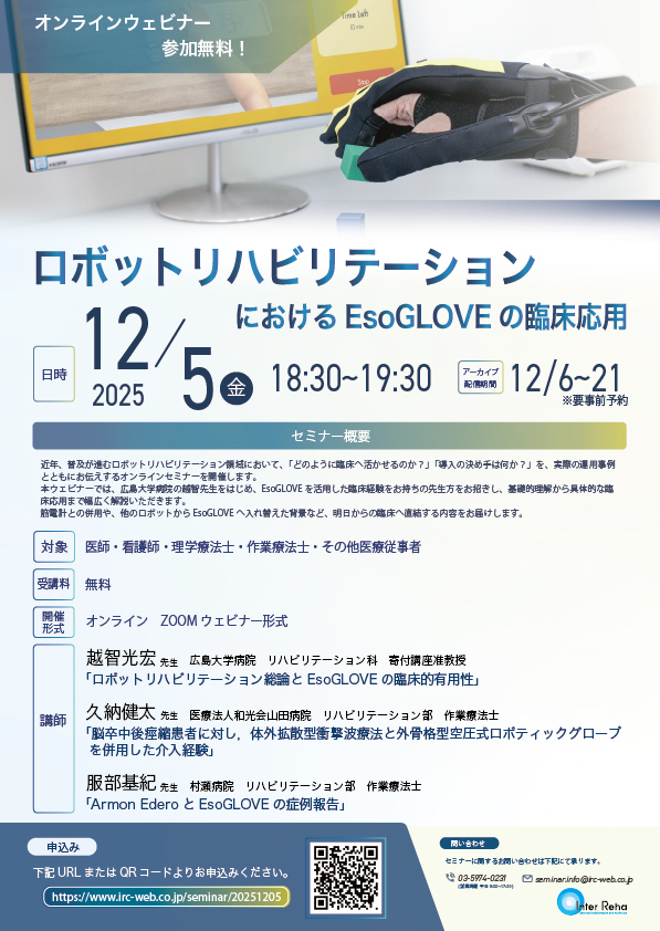 近年、普及が進むロボットリハビリテーション領域において、「どのように臨床へ活かせるのか?」「導入の決め手は何か?」を、実際の運用事例とともにお伝えするオンラインセミナーを開催します。