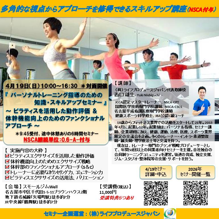 パーソナルトレーニング指導のための知識・スキルアップセミナー(ピラティス編、NSCA継続単位:0.6CEU-A-付与、名古屋開催) パーソナルトレーニング指導のための知識・スキルアップセミナ…