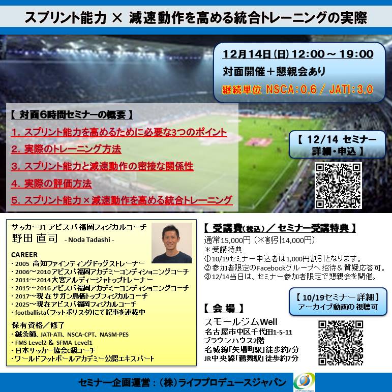 スプリント能力 × 減速動作を高める統合トレーニングの実際(NSCA:0.6CEU-A-付与、JATI:3.0付与、名古屋対面開催) スプリント能力 × 減速動作を高める統合トレーニングの実際…