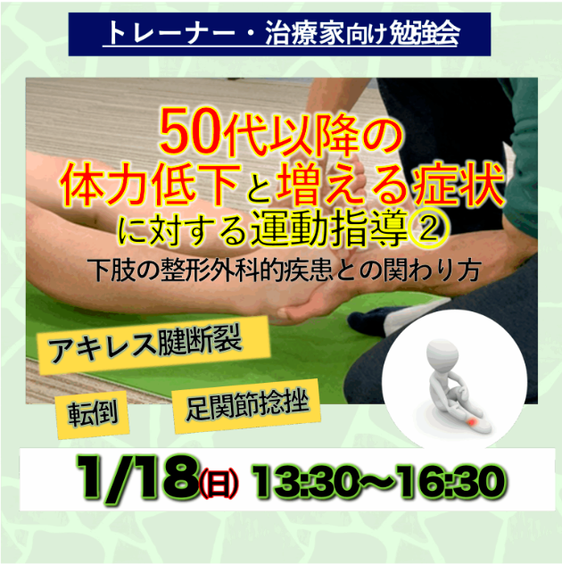 50代以降の体力低下と増える症状に対する運動指導② 〜慢性的な膝痛、アキレス腱断裂、平衡感覚低下による転倒・捻挫など下肢の整形外科的疾患との関わり方〜 50代以降の体力低下と増える症状に対する運動指導② 〜慢…