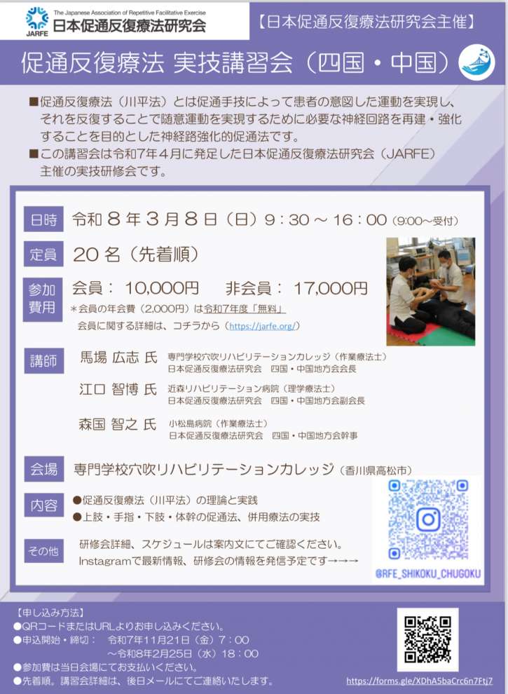 この度、地域技術研修コースを以下の要領で開催する運びとなりました。四国ではコロナ禍でなかなか開催できず、久々の開催になります。大変お待たせいたしました。今回の内容は、仙腸関節の副運動技術と下肢の副運動と構成運動の技術を中心に予定しています。非会員の先生方も参加可能です。興味のある方、この機会に参加してみませんか。皆様の多数のご参加をお待ちしております。