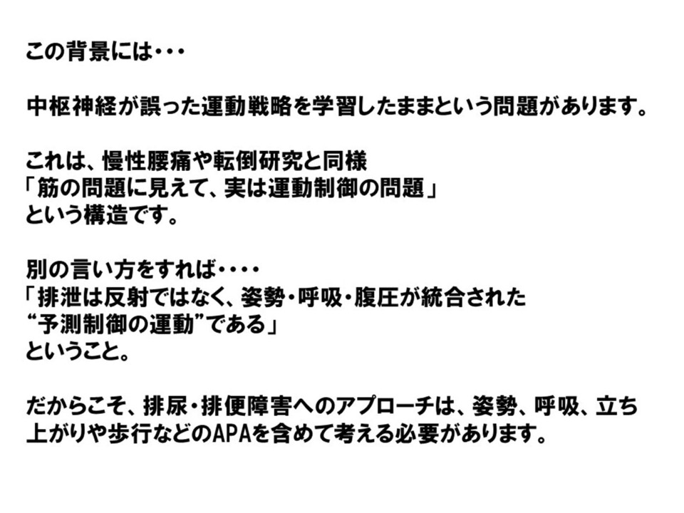 このような病態に対しては、骨盤底筋群や排泄に関与する筋群のトレーニングに加え、正しい姿勢の再獲得と体幹筋群の活性化を図ることで、内臓アライメントを整え、排泄機能の改善が期待されます。