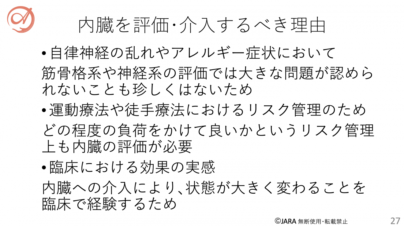 本研修では、自律神経の問題に対して、クリニカルリーズニング(評価・仮説・介入・再評価・検証)を通して、具体的にどのようにして症状の解消につなげるかを学んでいただきます。