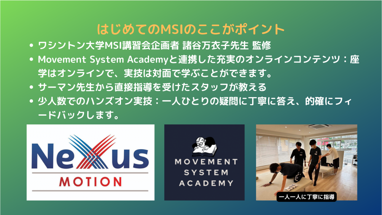 MSI(Movement System Impairment)コンセプトを基に、姿勢や動作を評価し、適切に修正していくための実践的スキルを、わかりやすく、丁寧にご指導いたします
