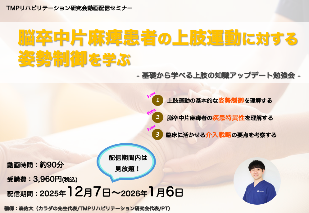 本勉強会(動画配信)は脳卒中片麻痺者の上肢について多角的に理解するためのポイントを学びます。
