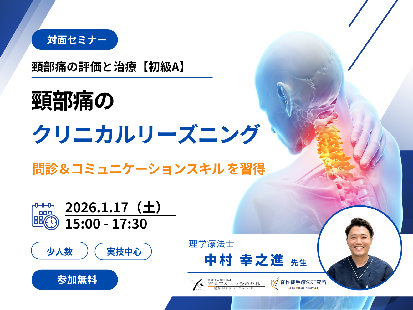 頸部痛の評価と治療を基礎から学びたい方、頸椎へのアプローチに不安を感じている方、臨床推論力をさらに高めたい方は、ぜひ本研修会にご参加ください。