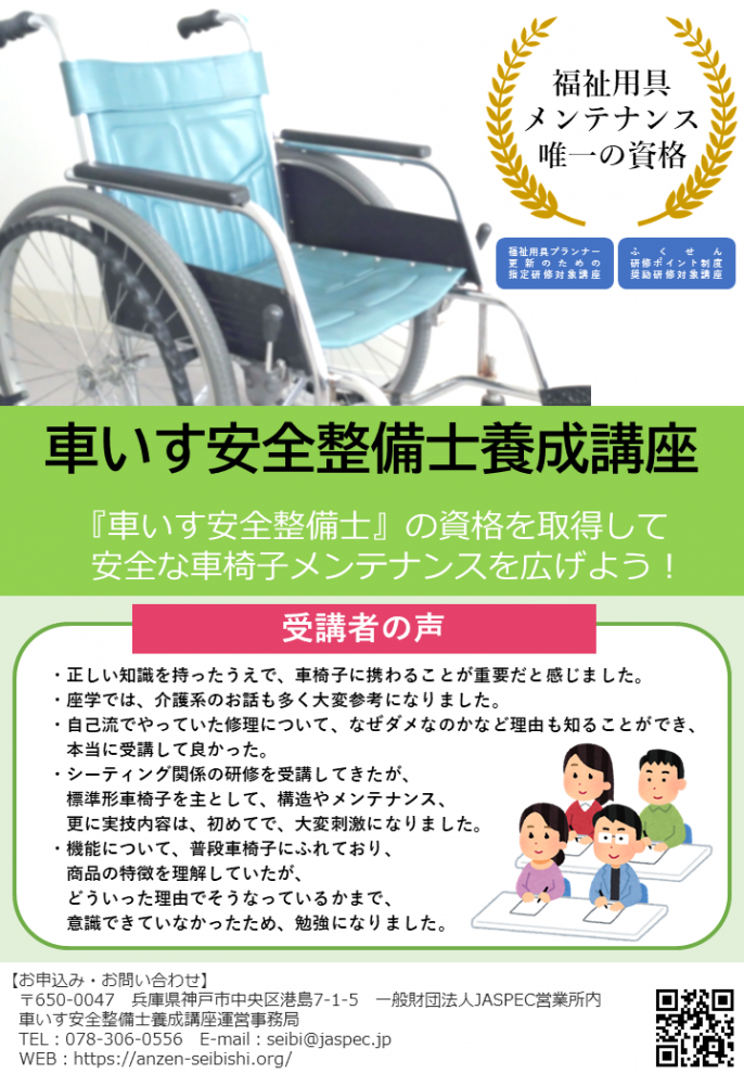 車いす安全整備士養成講座のホームページより、お申込み・お問い合わせください。