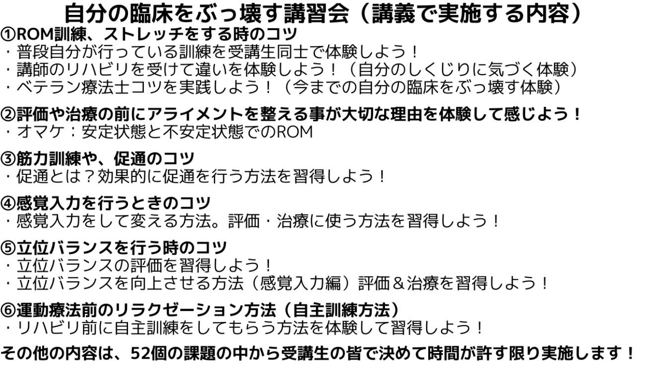 オススメ内容は、明日の臨床で意識して行うだけで、翌日の臨床のROMや、ストレッチや、筋力訓練の全ての考え方・実技効果が強烈に変わった!と実感できます!
