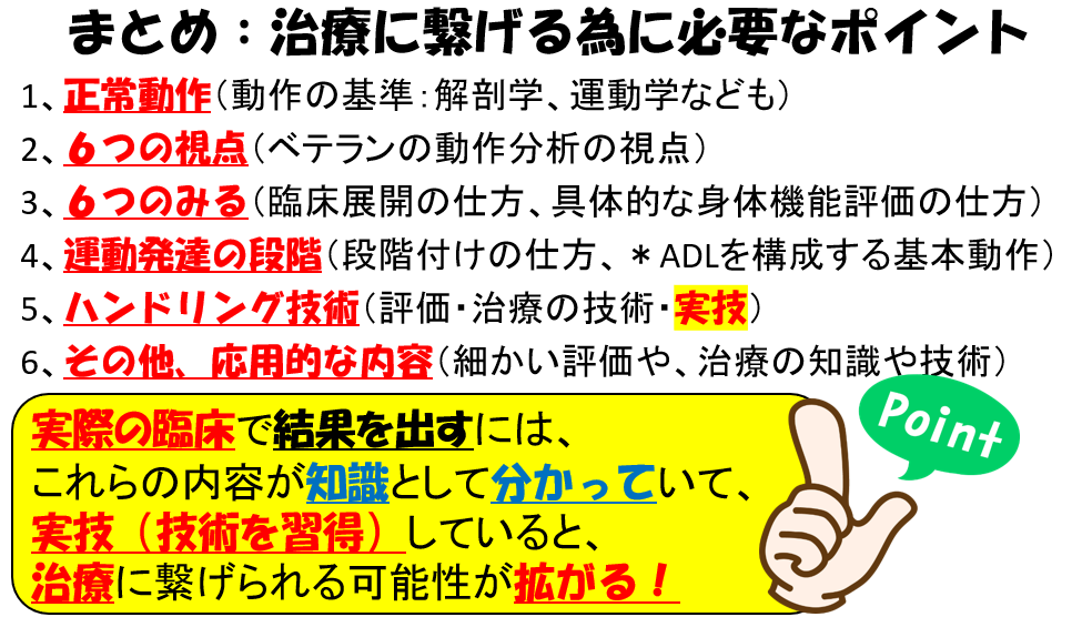 ・具体的に、コツが理解できたら、寝返り・起き上がり、立ち上がり動作のハンドリング(徒手的な誘導)を徹底的に習得します。
