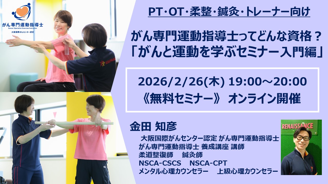 【2/26【無料セミナー】PT・OT・看護・柔整・鍼灸 対象ウェビナー「がん専門運動指導士とはどのような資格?」 【2/26【無料セミナー】PT・OT・看護・柔整・鍼灸 対…