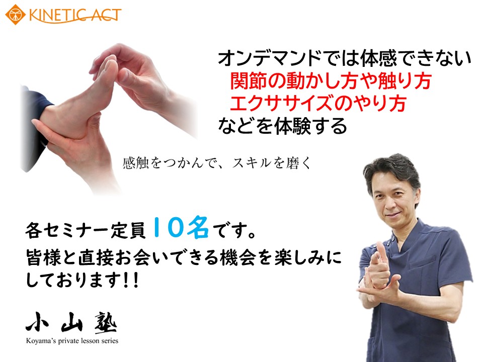 そこで、関節の動かし方や触り方、エクササイズのやり方などを実際に体験することで、より内容を理解でき、皆さんのスキルアップにつながると考え『小山塾』の実践編として対面でのセミナーを開催することにしました。