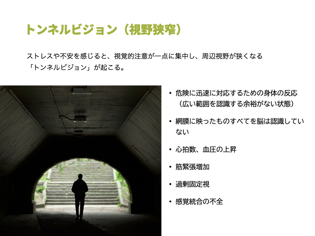 「力を抜いて」と言っても抜けないのは、視覚性のストレスが自律神経(交感神経)を刺激し続けているからです。