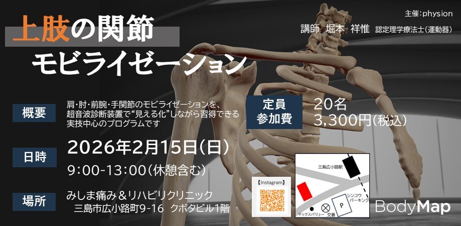 本講習は、肩・肘・前腕・手関節のモビライゼーションを、超音波診断装置で『見える化』しながら習得できる実技中心の特別プログラムです。触診や徒手技術で迷いやすい上肢の複雑な関節構造を、リアルタイム画像で確認しながら学ぶことで、