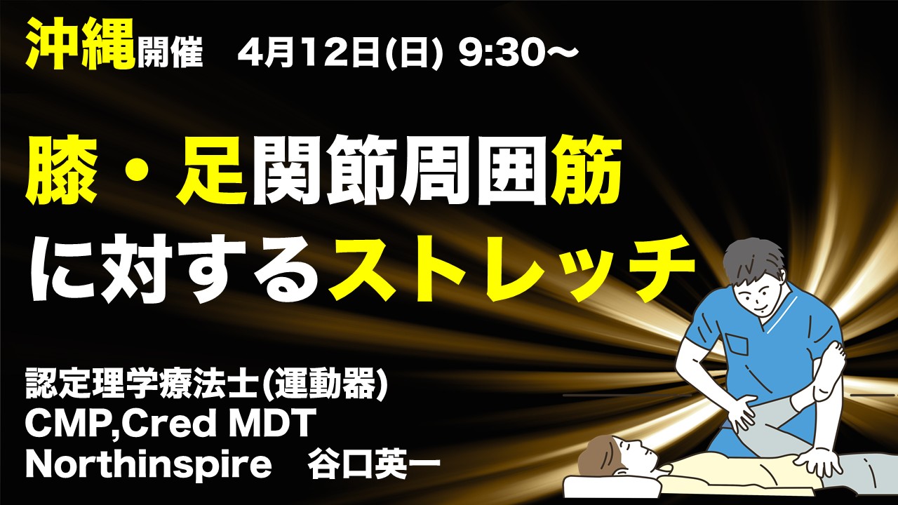 この度、Northinspireでは4月に那覇で対面実技形式で「膝・足関節周囲筋に対するストレッチと触診」を開催致します。膝関節周囲骨折、ACL損傷、半月板損傷、変形性膝関節症、足関節捻挫、足関節骨折など臨床で遭遇する機会の多い膝・足関節疾患は、関節可動域制限(拘縮)や疼痛、不安定性など様々な機能障害を引き起こします。上行性運動連鎖の開始地点となる膝や足関節の機能障害は、下肢全体はもちろん体幹にも悪影響を及ぼします。また、骨折後の拘縮は生活復帰や職業復帰を妨げる直接的な要因となり、セラピストの技術や経験が予後や回復期間を左右します。