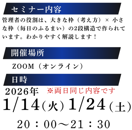 管理者になったけれど、何から手をつければいいのかわからない。現場も管理も両立しながら、管理者の「考え方」と「実践」を90分で整理します。