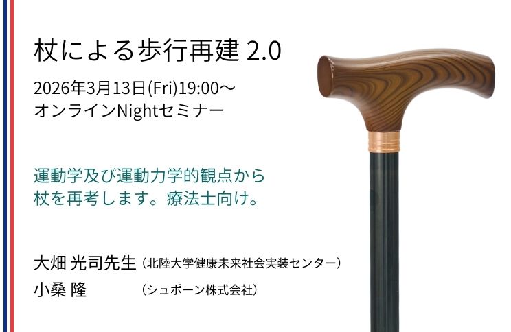 本研修会では、日本神経理学療法学会理事長である北陸大学の大畑光司教授をお招きし、杖の役割を「運動学および運動力学的観点」から概説していただきます。