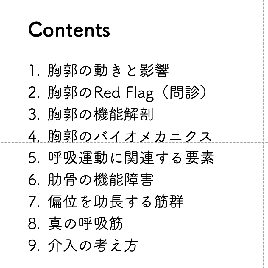 理論編の目次です。胸郭のバイオメカニクスや触診方法についての動画もあります。
