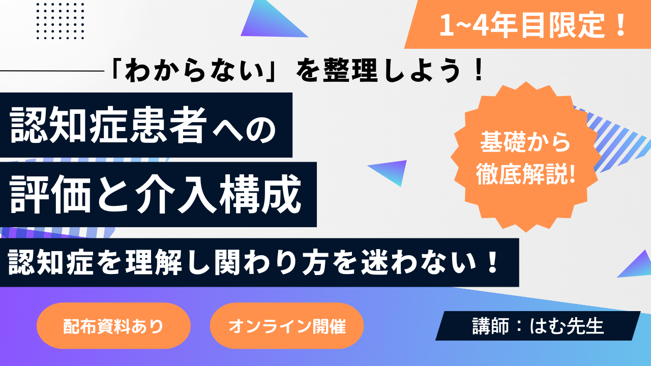 『認知症セミナー』新1〜4年目限定!「わからない」を整理しよう!認知症患者への評価と介入構成