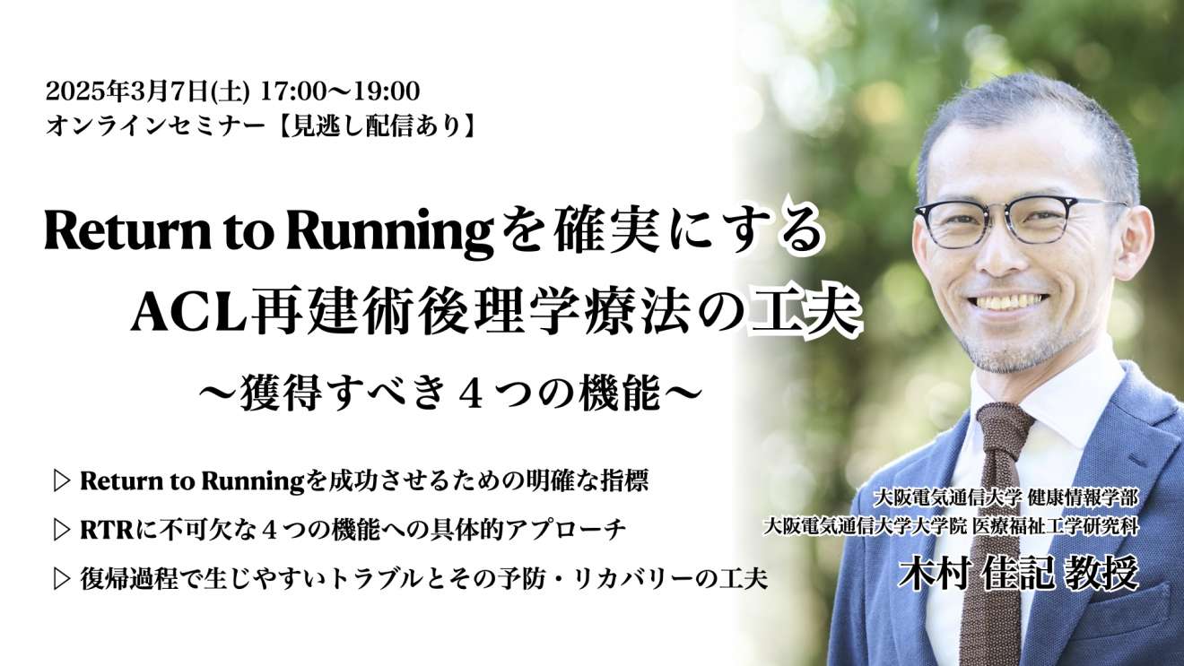本講演では、主にRTRまでの回復過程に焦点を当て、研究知見を踏まえた理学療法介入の要点を解説します。加えて、その過程で生じやすいトラブルと予防・リカバリーの工夫についてもお話します。