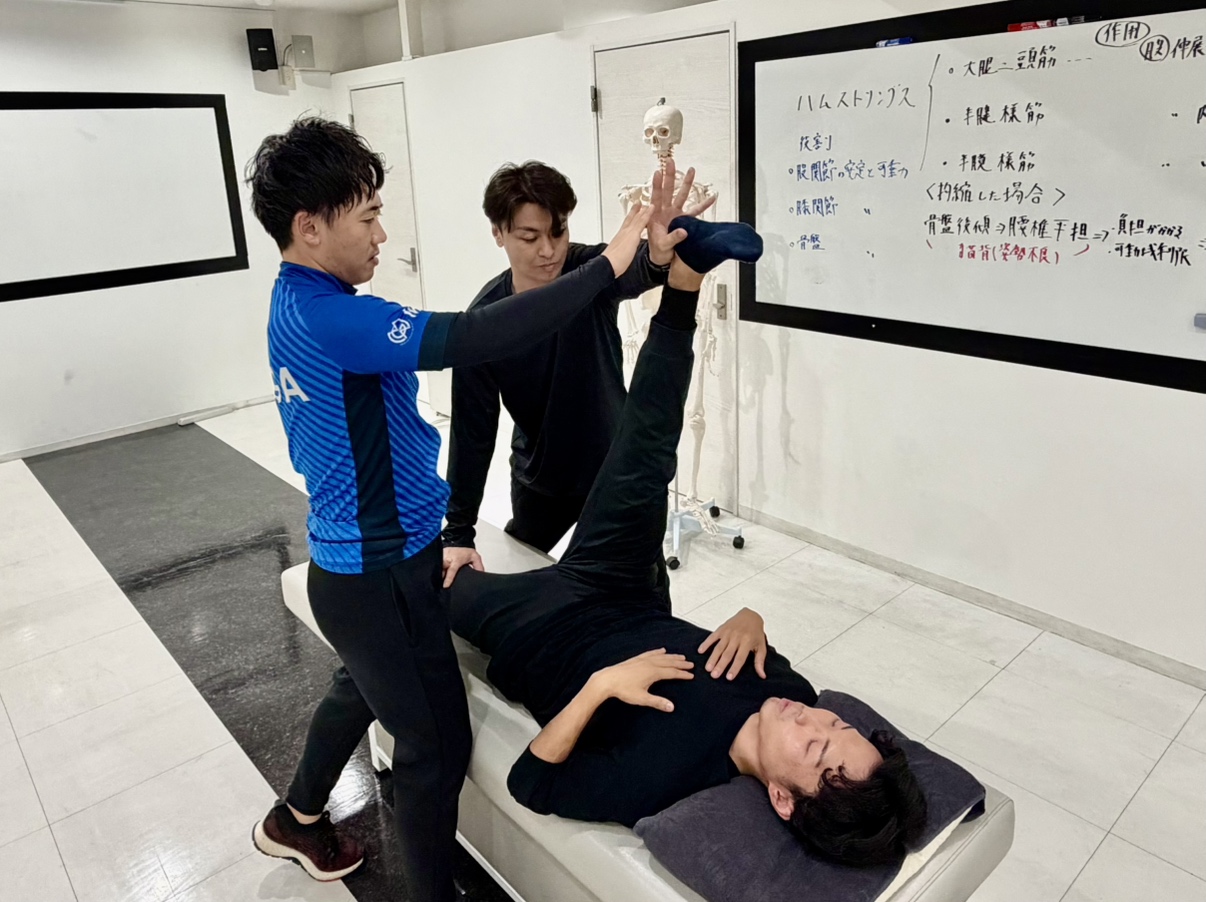 大腿部4種類のストレッチ技術を、機能解剖学と実技の両面から習得します。