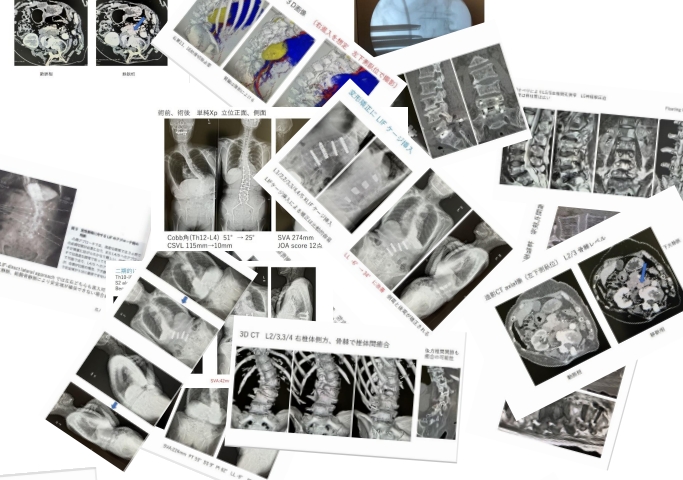 ・71歳女性:現病歴40歳頃から脊柱の変形を指摘される。 徐々に変形が進行 最近では立位維持が困難、歩行には杖が必要となり、間欠性跛行約100m、立位保持は5分程度、また胃腸障害(いわゆるGERD)も出現• 両下肢:知覚障害なし、筋力低下なし、腱反射正常、FNST ,SLRT正常
