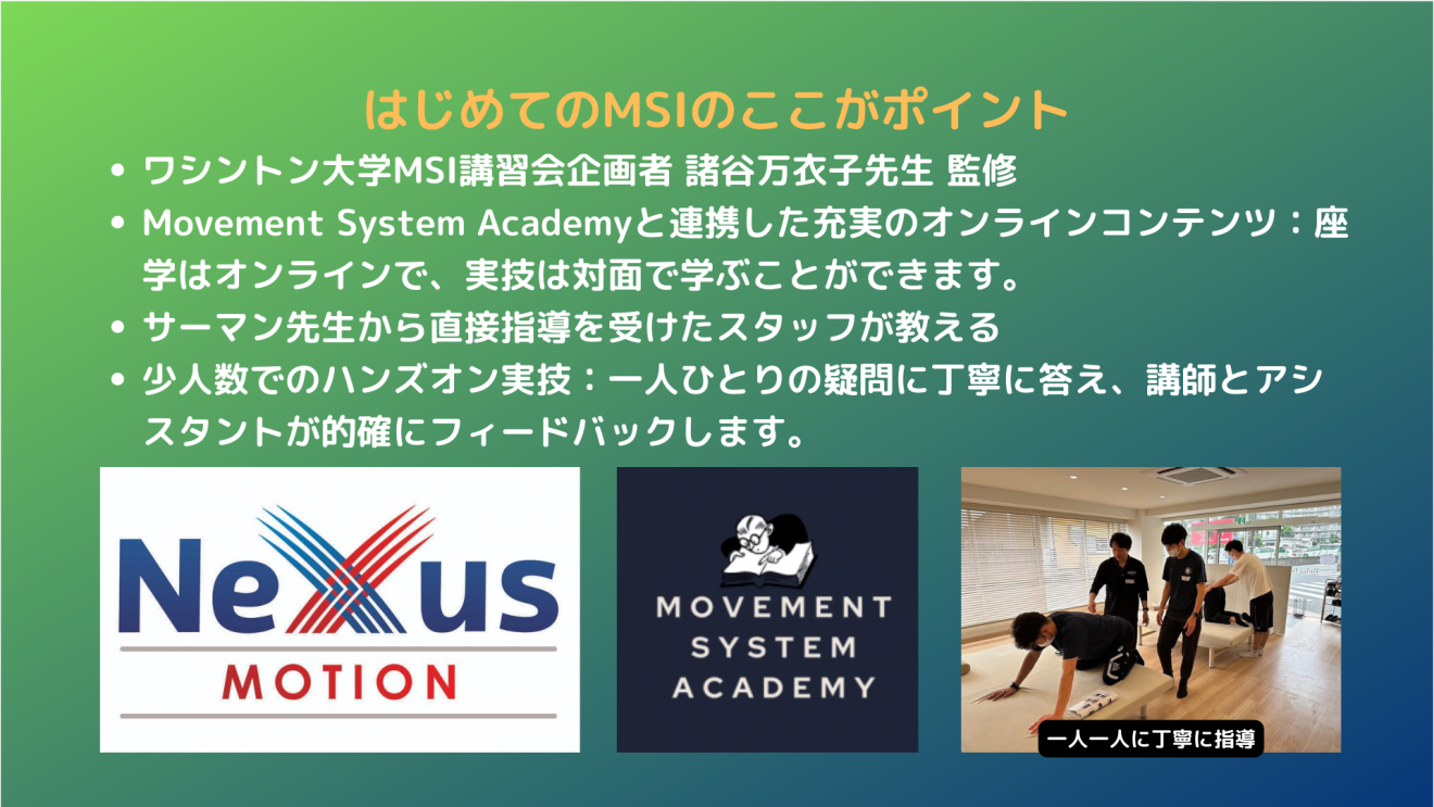MSI(Movement System Impairment)コンセプトを基に、姿勢や動作を評価し、適切に修正していくための実践的スキルを、わかりやすく丁寧に指導します。