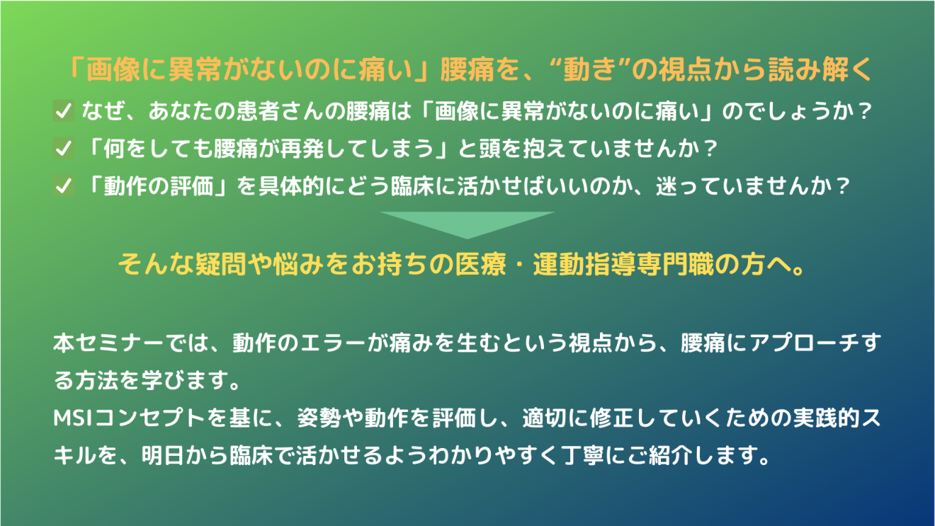 本セミナーでは、動作のエラーが痛みを生むという視点から、腰痛にアプローチする方法を学びます。