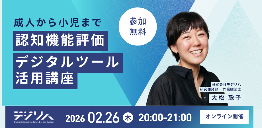 そんな悩みを抱えるリハビリ専門職の方向けに、認知機能評価の整理と、デジタル活用の可能性・限界を一緒に捉え直すセミナーを企画しました! 本セミナーでは、株式会社デジリハ研究開発部の作業療法士 大松聡子 が講師として、注意・記憶・遂行機能など主要ドメインの“押さえるべき考え方”と、PCやセンサーを用いた評価・介入設計のポイントを解説します。