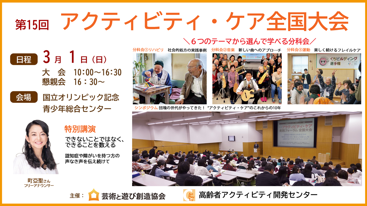 「アクティビティ・ケア全国大会」は、年に一度、認知症ケア、介護予防にかかわる多職種が集い、専門家の講演や実践報告、分科会を通して、今現場で行われている実践を学び合う大会です。