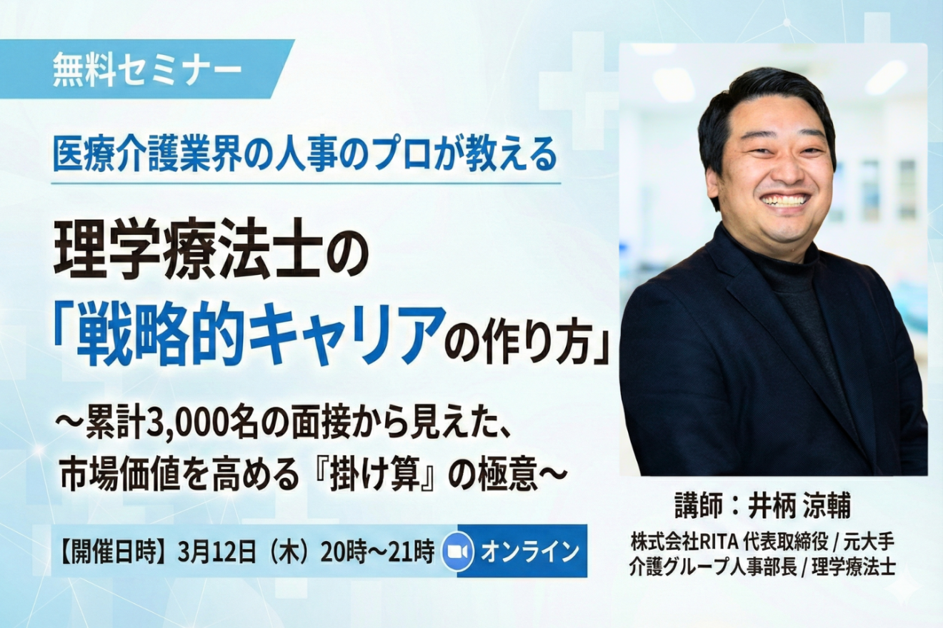 理学療法士として回復期病棟・介護現場で12年従事。大手介護グループの法人本部長兼人事部長として、年間約400名、累計3,000名以上の採用選考を経験。「専門職の離職」という業界課題に危機感を抱き、2025年に人事代行を主軸とする株式会社RITAを設立。現在は経営者・人事責任者の隣で「選ぶ側の本音」に触れ続けている。現場技術を市場価値へ変換する「戦略的キャリア」の言語化を支援する、人事と臨床の架け橋。