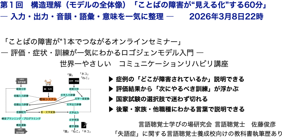 第1回|構造理解 入力・出力/音韻・語彙・意味/双方向処理 ????ことばの全体像を1本で理解 https://peatix.com/event/4889228