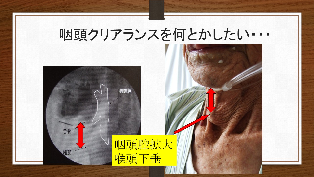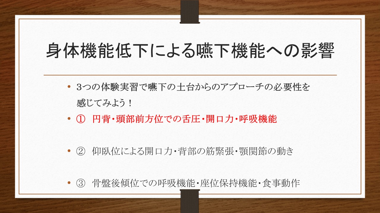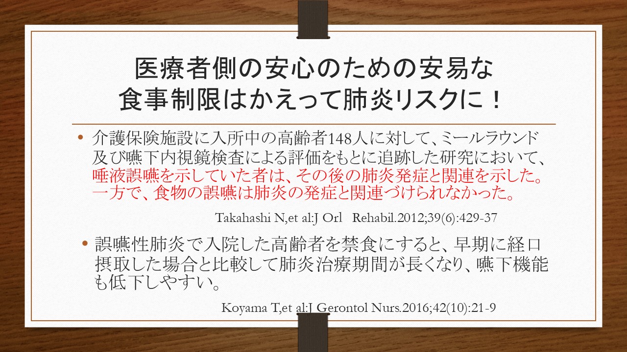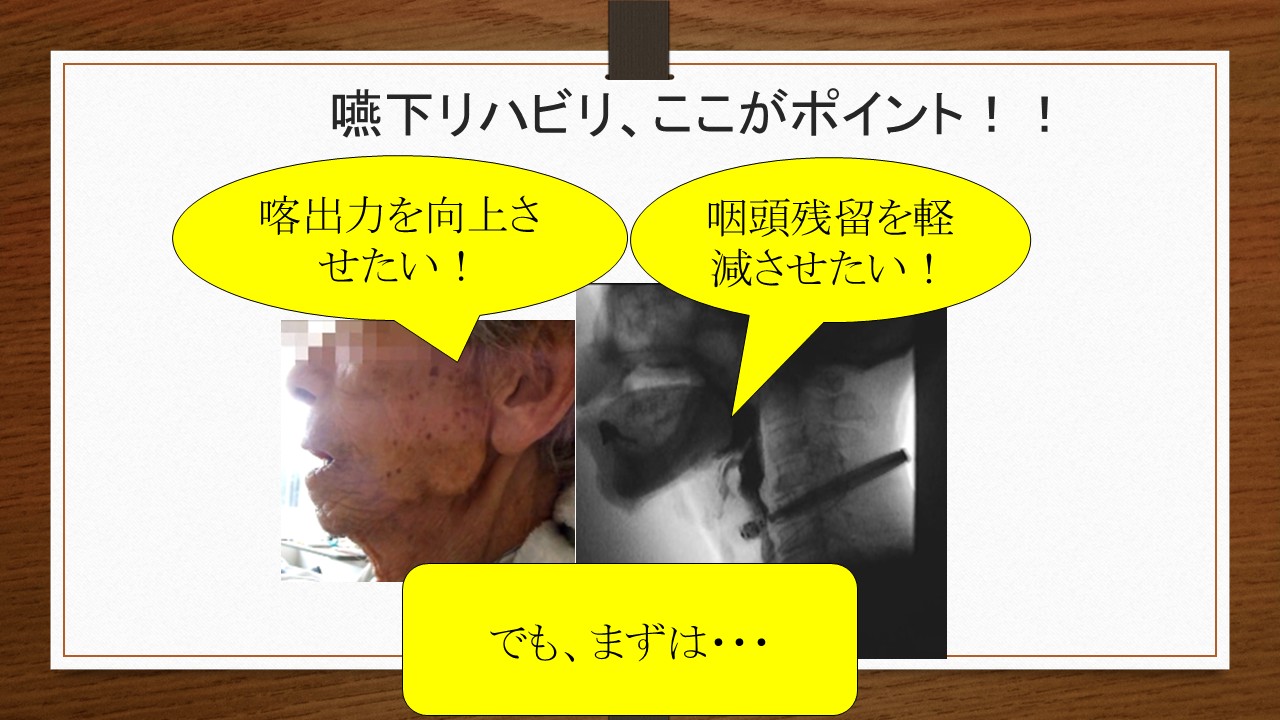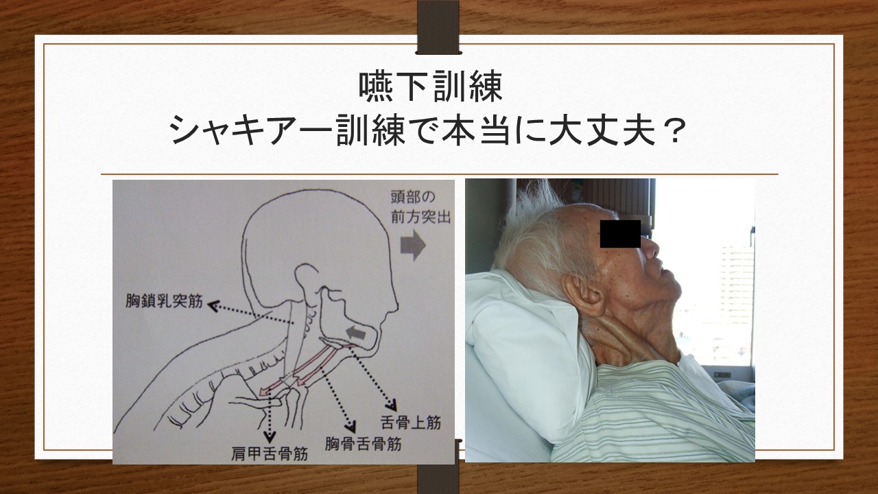 また、私は、現在の超高齢社会においては、「誤嚥リスクの軽減」より、「誤嚥性肺炎リスクの軽減」を意識した嚥下リハビリが重要になってきていると感じています。そのためには、身体機能にも目を向けた幅広い「間接訓練」が必要不可欠です。「舌が前に出ないからガーゼで舌を引きだす」、「飲み込みが弱いからシャキア訓練で頸部前面の筋を鍛える」など、目の前の口腔の問題だけをみて訓練を行っているのではうまくいかないことを、皆さん自身が感じていることでしょう。