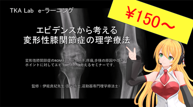変形性膝関節症のROM制限,筋力低下,疼痛,歩様の原因や改善のポイントに対してエビデンスから考えるe-ラー二ングです。