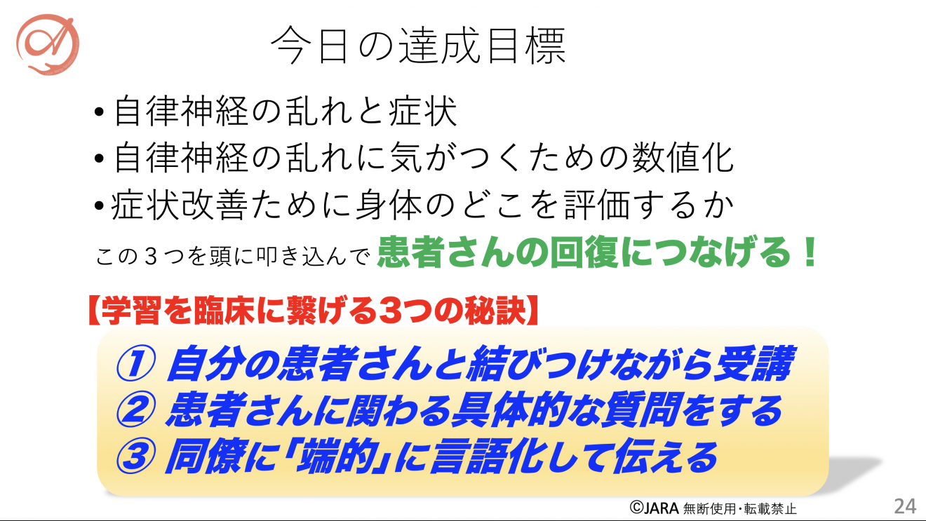 本研修では、自律神経の問題に対して、クリニカルリーズニング(評価・仮説・介入・再評価・検証)を通して、具体的にどのようにして症状の解消につなげるかを学んでいただきます。