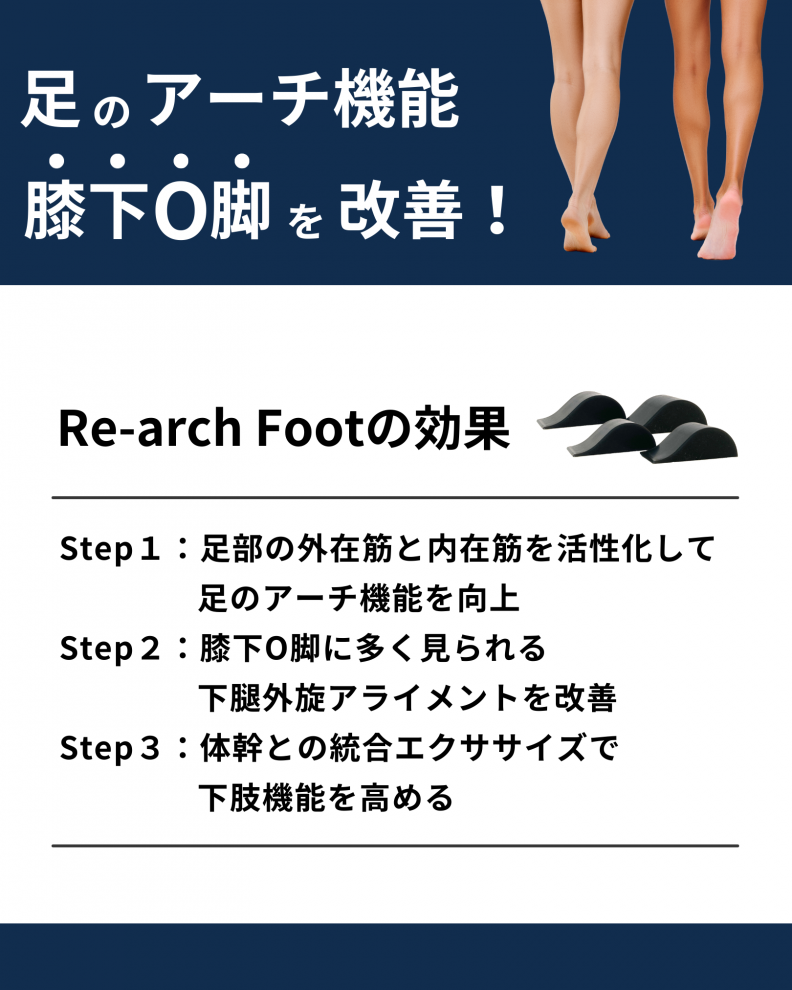 セミナー当日は、下肢のアライメントおよび機能評価方法をはじめ、「Re-arch Foot:リアーチフット」というツールを活用して、現代人が失いやすい足部のアーチを整えながら、下肢の機能改善、スタイル改善、パフォーマンス向上に効果的な実技エクササイズをお伝えいたします。