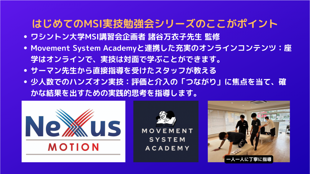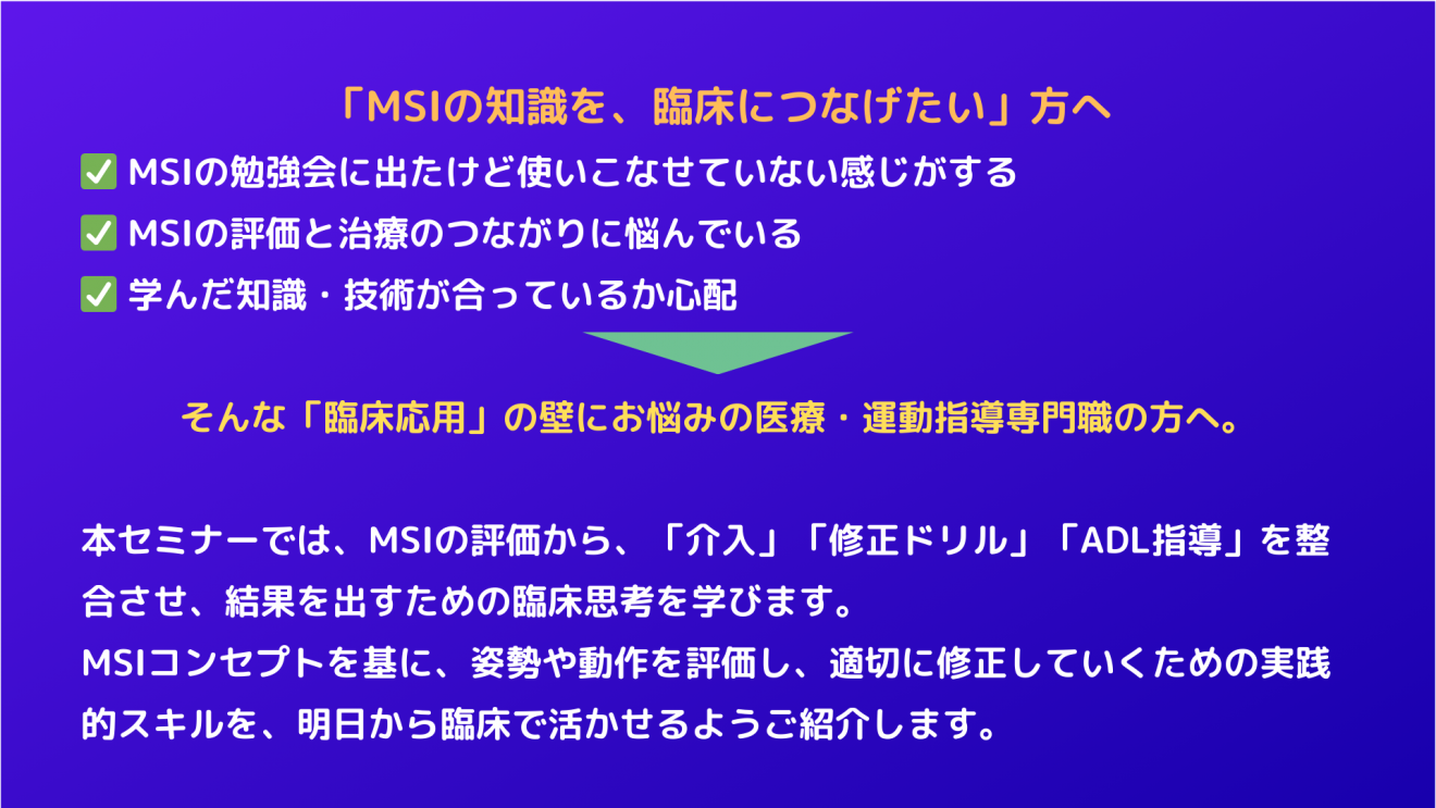 本勉強会は、MSI(Movement System Impairment:運動系機能障害)コンセプトを深く理解し、臨床現場で「使いこなせる」ようになることを目的とした経験者向けの実技勉強会です。