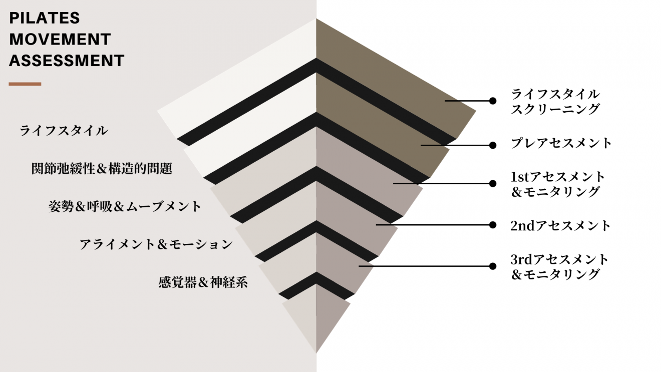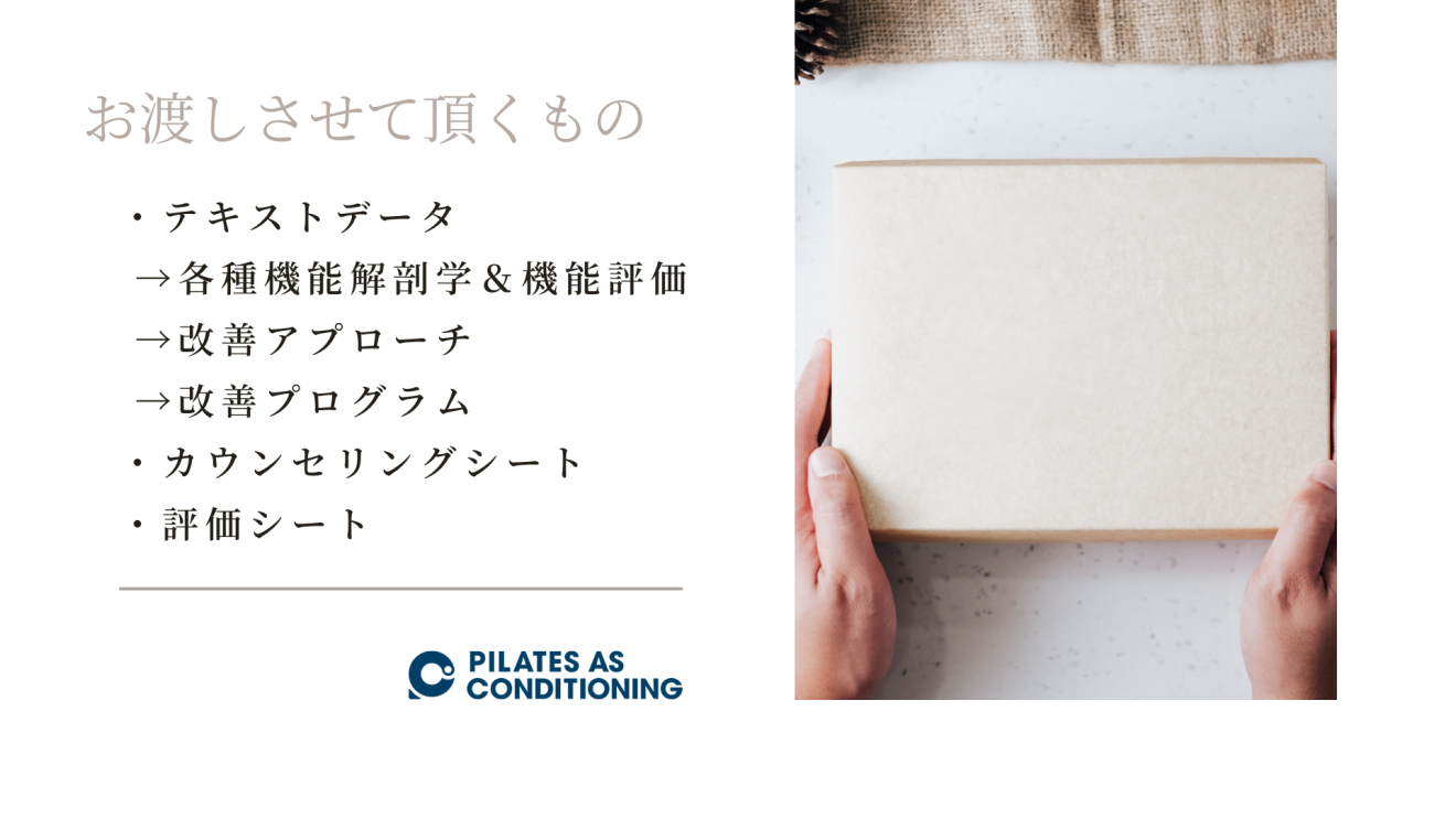 ピラティスやピラティスを活用したコンディショニングを、安全に効果的に提供し、クライアントの目的を叶えるのに必要となる「プレアセスメント」&「ステップアセスメント」をさらに掘り下げ、機能解剖や機能評価を徹底的に学び、目の前のお客様の改善ポイントを明確にし、その改善ポイントに対応したアプローチを学び実践していく2日間のコースです。