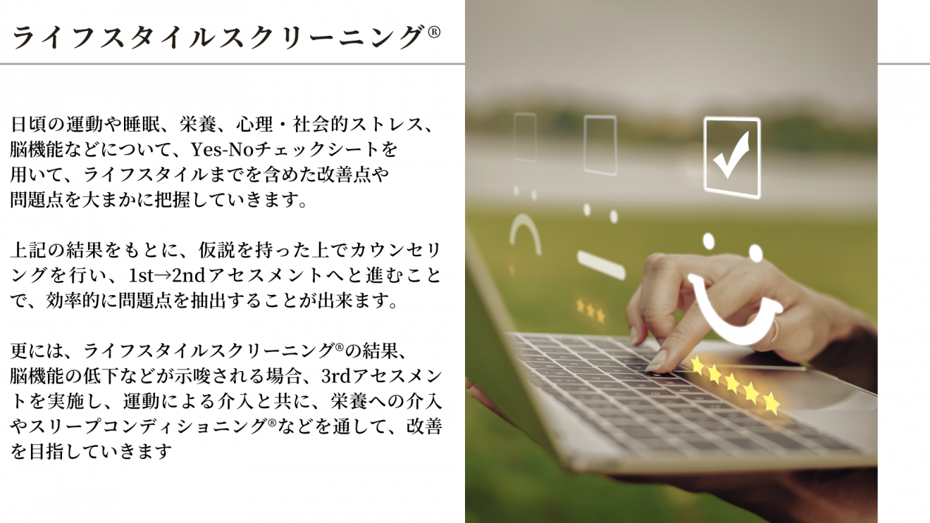 更には、ライフスタイルスクリーニング®の結果、感覚器や脳機能のエラーが示唆される場合、3rdアセスメントを通して、感覚器や神経系の評価を行い、多角的にアプローチをしていきます。