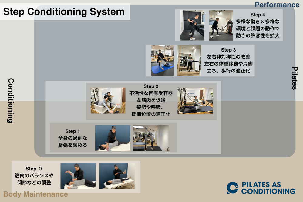 Pilates as Conditiong Academyの養成コースでは、安全に、効果的にエクササイズを選択し、指導をする為の方向性をStep理論としてまとめ、さらには1人1人のお客様に合わせて、最適なエクササイズが選択できる様に、7種類のプレアセスメントと6種類のステップアセスメントを実施。