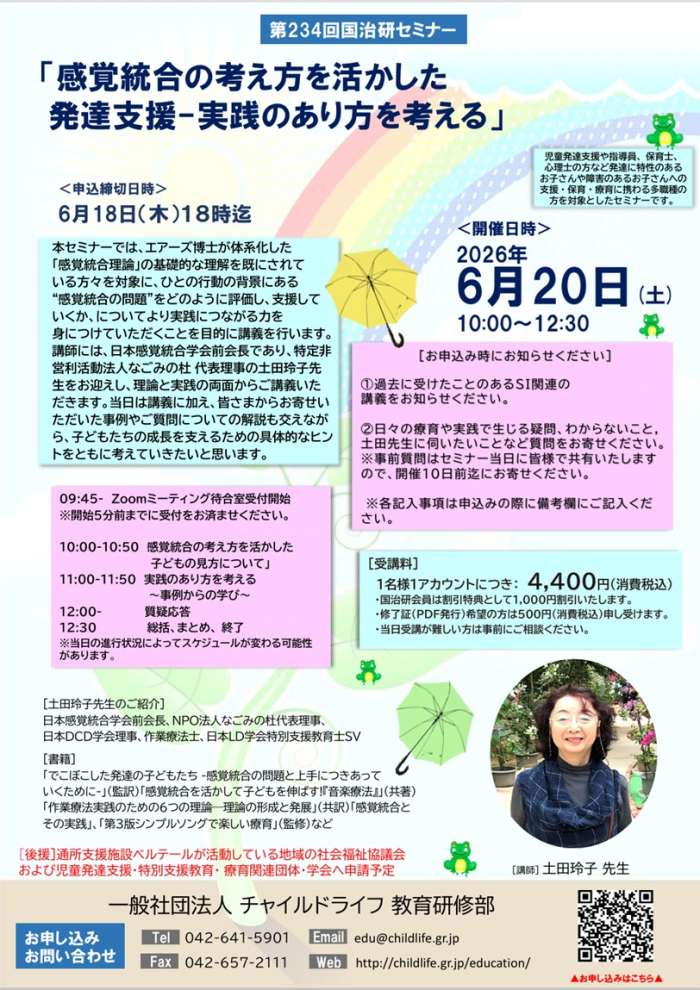 土田玲子先生は過去にも第14回ベルテール教育セミナー「感覚統合~基礎的理解を深める~」、第203回国治研セミナー「感覚統合理論の基礎的理解に向けて」、第215回国治研セミナー「感覚統合理論の基礎的理解と子供の成長を支える支援」、第223回国治研セミナー「感覚統合理論の基礎的理解を深める~発達のちょっと気になる子を支える支援~」に登壇していただきました。