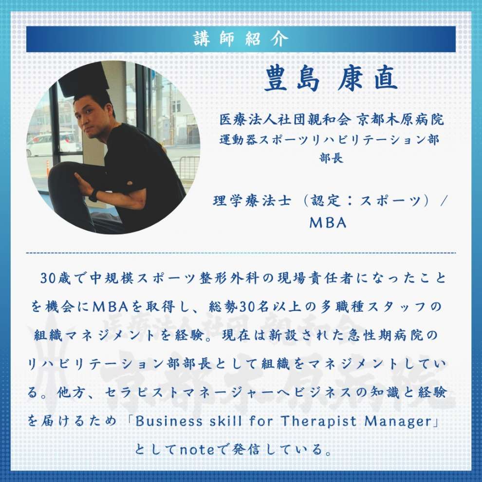 30歳で中規模スポーツ整形外科の現場責任者になったことを機会にMBAを取得し、総勢30名以上の多職種スタッフの組織マネジメントを経験。現在は新設された急性期病院のリハビリテーション部部長として組織をマネジメントしている。他方、セラピストマネージャーへビジネスの知識と経験を届けるため「Business skill for Therapist Manager」としてnoteで発信している。