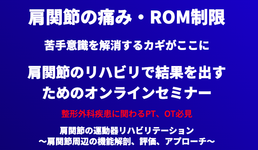 もしも、あなたが肩関節疾患のリハビリを担当していて、痛みやROM制限をうまく解決できずに困っているなら、このセミナーはお役に立てると思います。